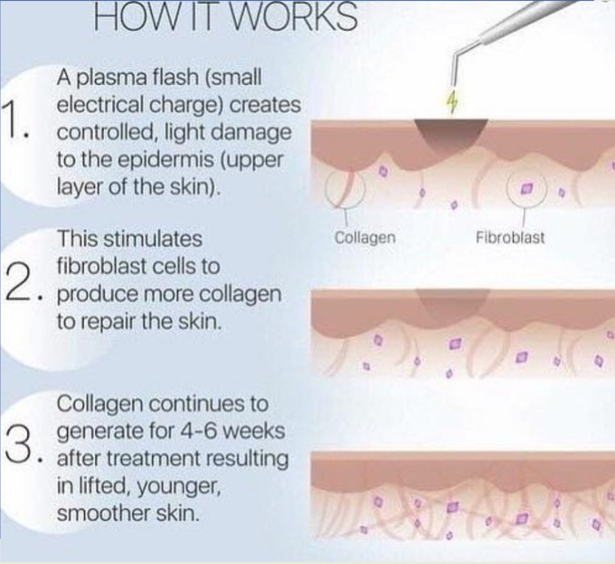 The thermal disruption, from the plasma fibroblast treatment breaks down proteins in the skin encourages new tissue regeneration and stimulates